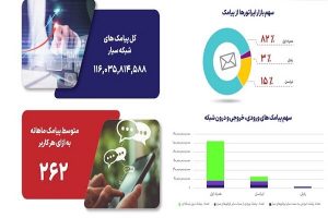 بر اساس این گزارش کل پیامکهای شبکه سیار ۱۱۶,۰۳۵,۸۱۴,۵۸۸ دقیقه است که سهم بازار اپراتورها از پیامک همراه اول ۸۲ درصد، ایرانسل ۱۵ درصد و رایتل ۳ درصد است و متوسط پیامک ماهانه به ازای هر کاربر ۲۶۲ است و سهم پیامکهای ورودی، خروجی و درون شبکه به شرح زیر است.